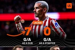格列兹曼此役替补出场送出助攻,帮助马竞取胜,据媒体统计,格列兹曼本赛季西甲替补出场参与7粒进球,首发参与0球。