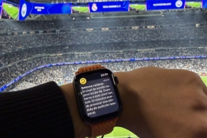 记者Jose Padilla社媒晒出照片,由于伯纳乌球场声浪太高,他的智能手表报警。