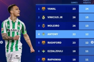 西甲边锋本赛季参与进球榜:亚马尔居首,维尼修斯、安东尼在列